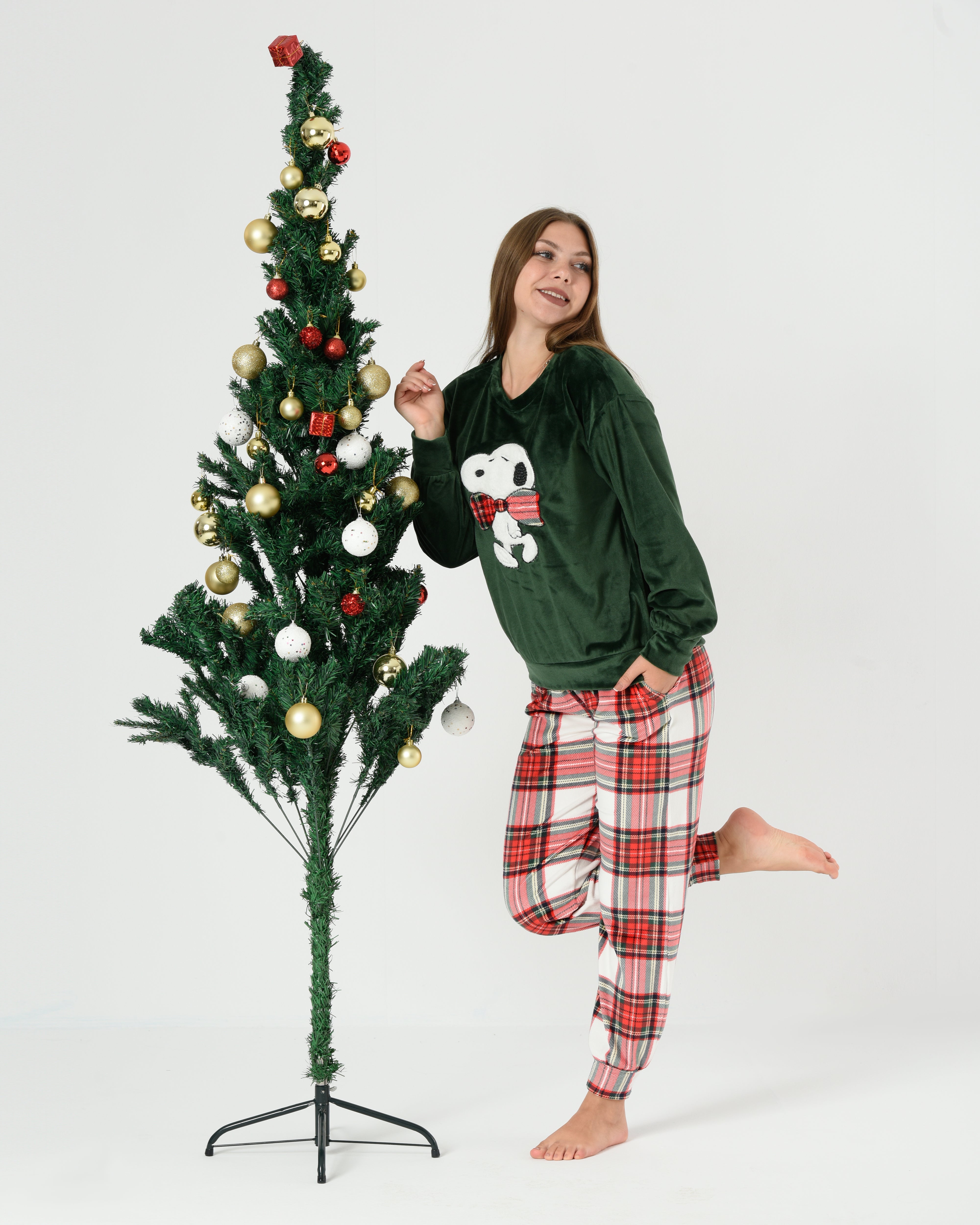 Women Winter Velvet Pajama Set – Snoopy Embroidery & Checkered Pants