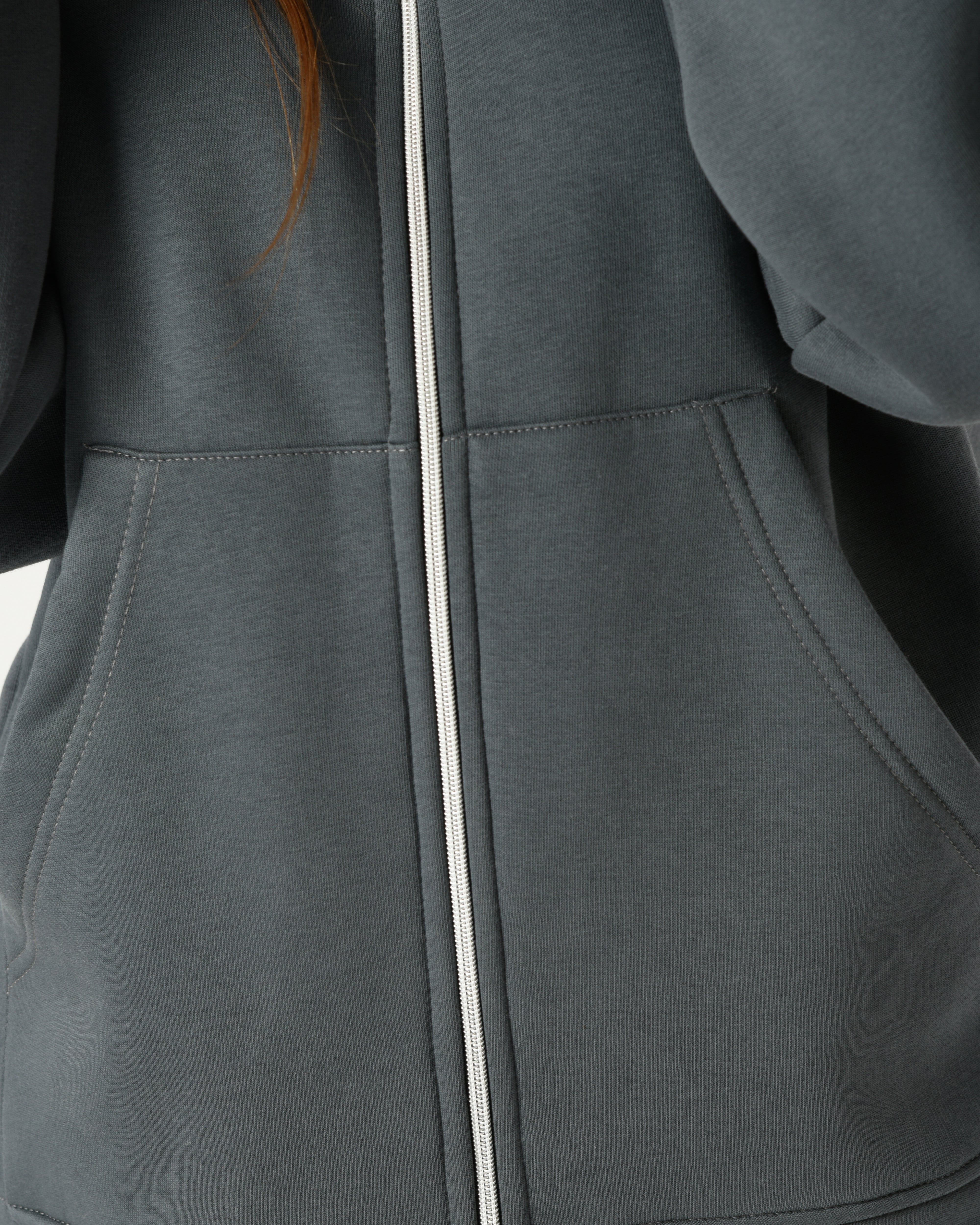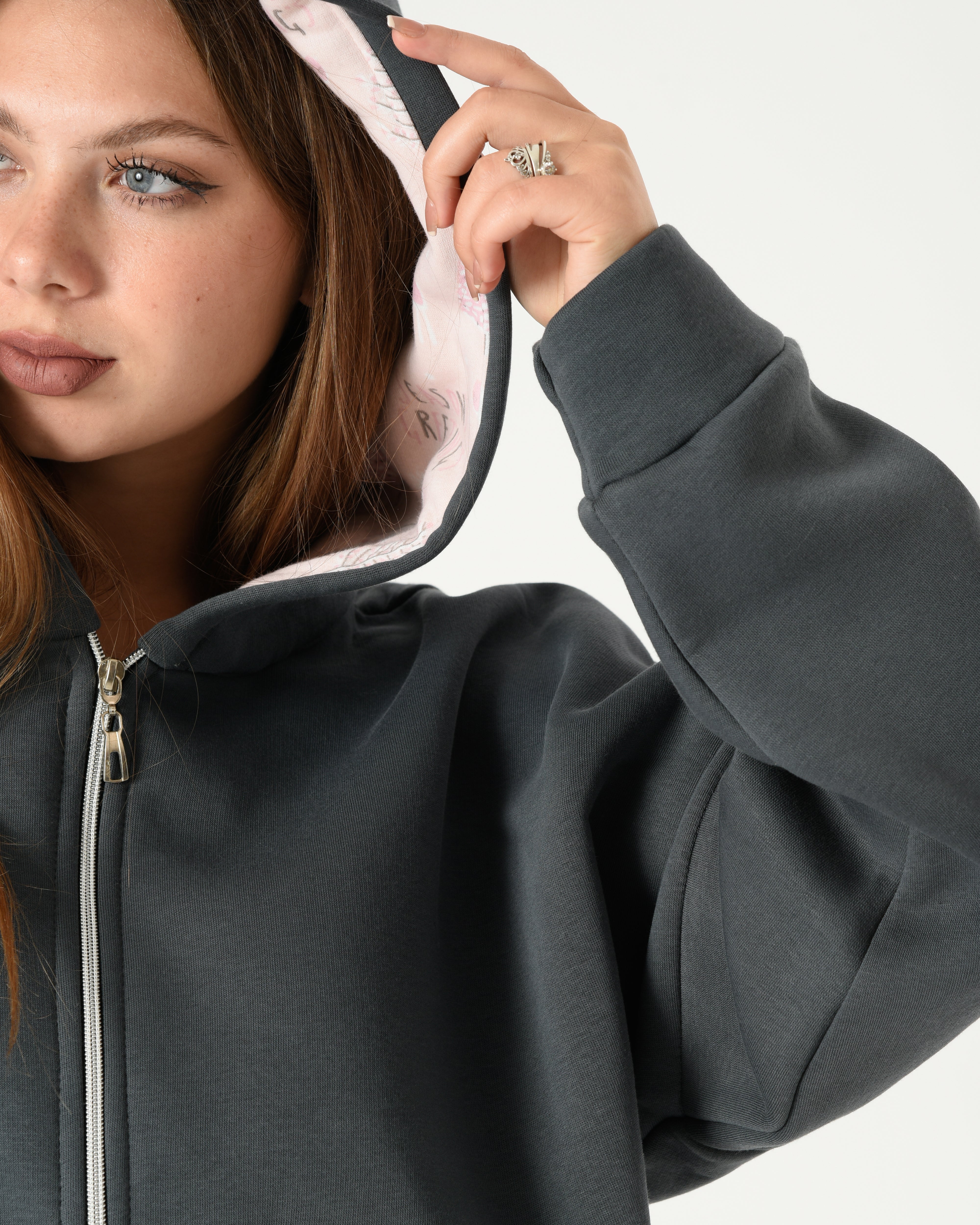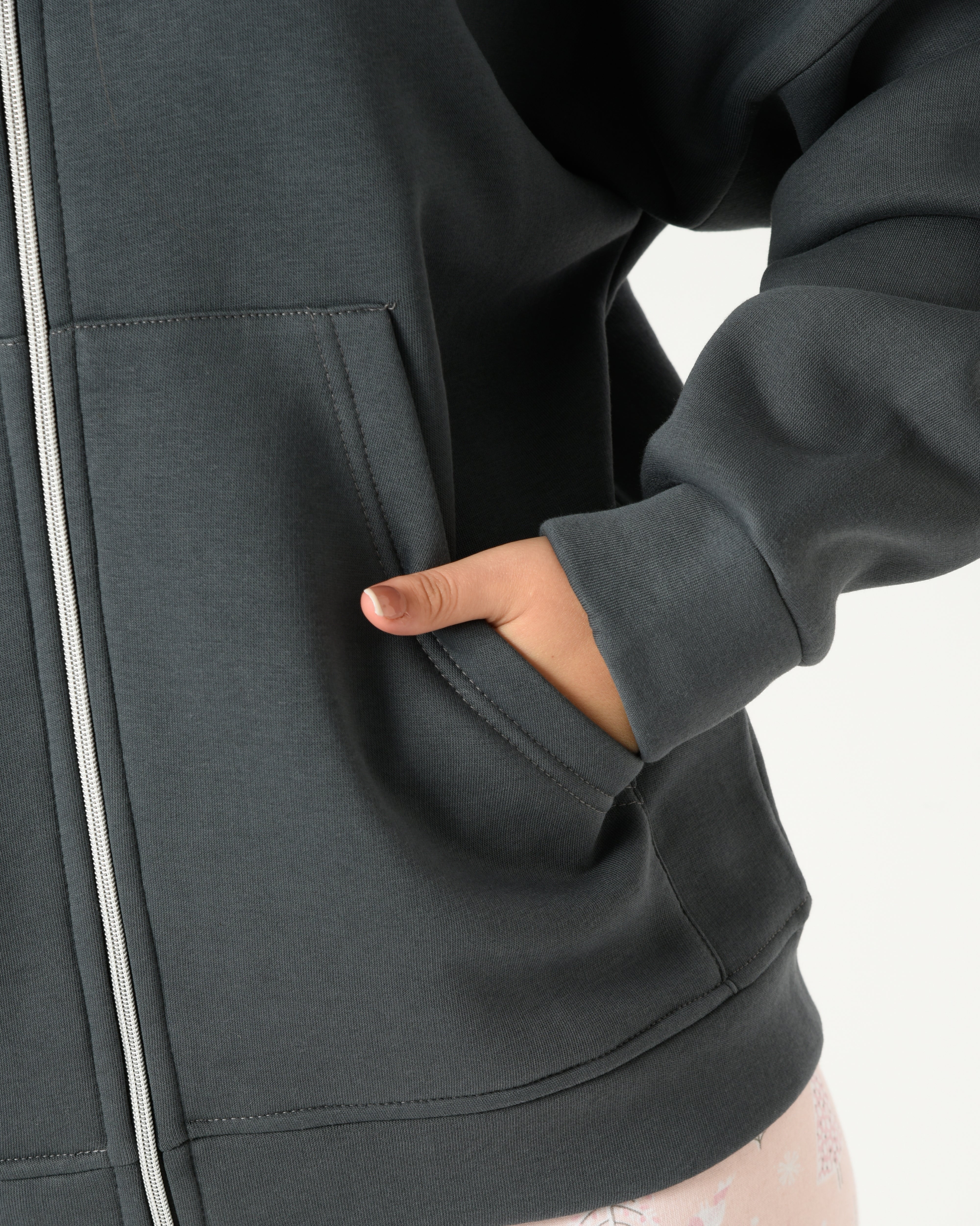 الجاكيت بتصميم هودي بسوستة أمامية وجيوب واسعة، والبنطلون منقوش بلون ناعم عشان يديكِ شكل أنثوي وعملي في نفس الوقت.