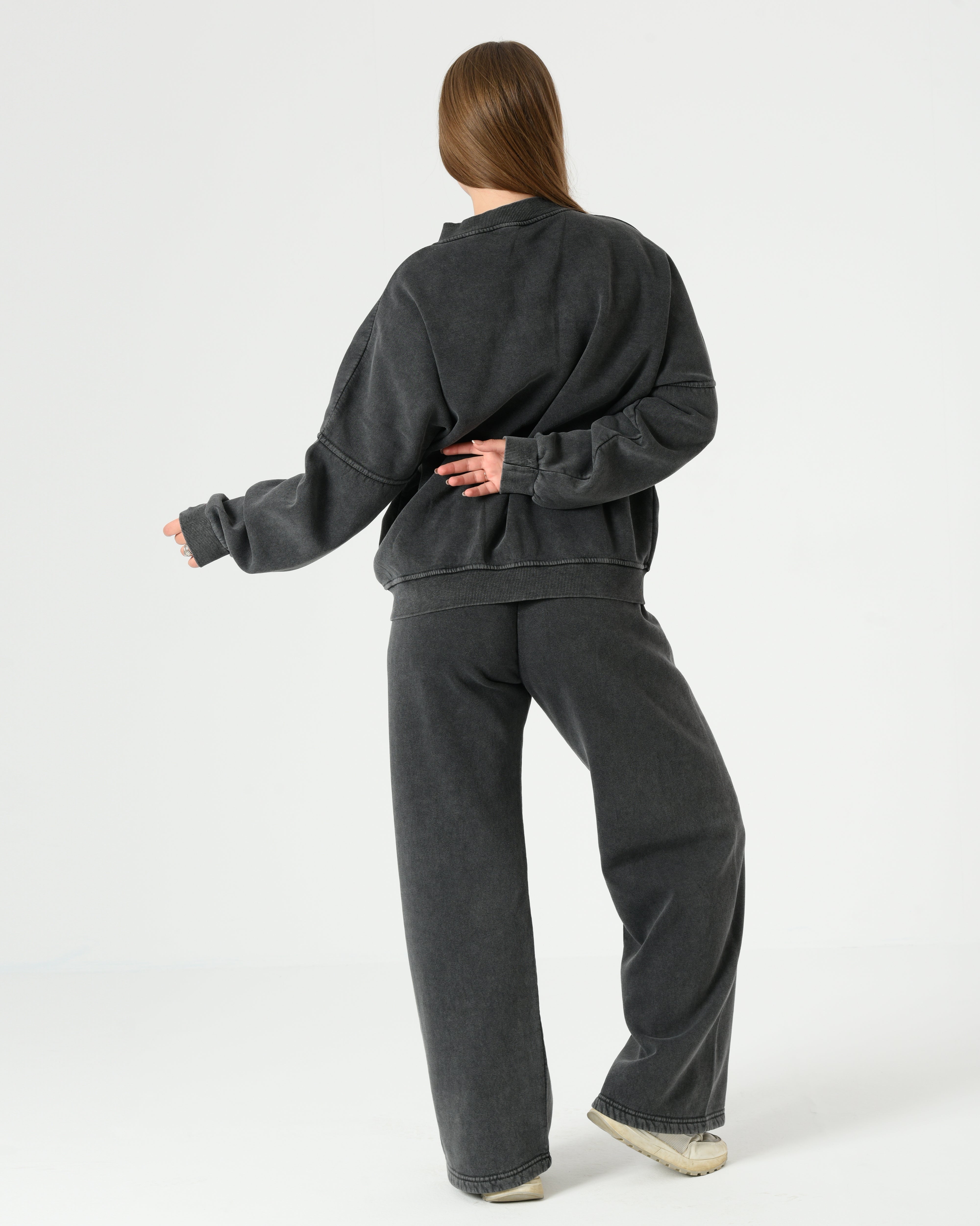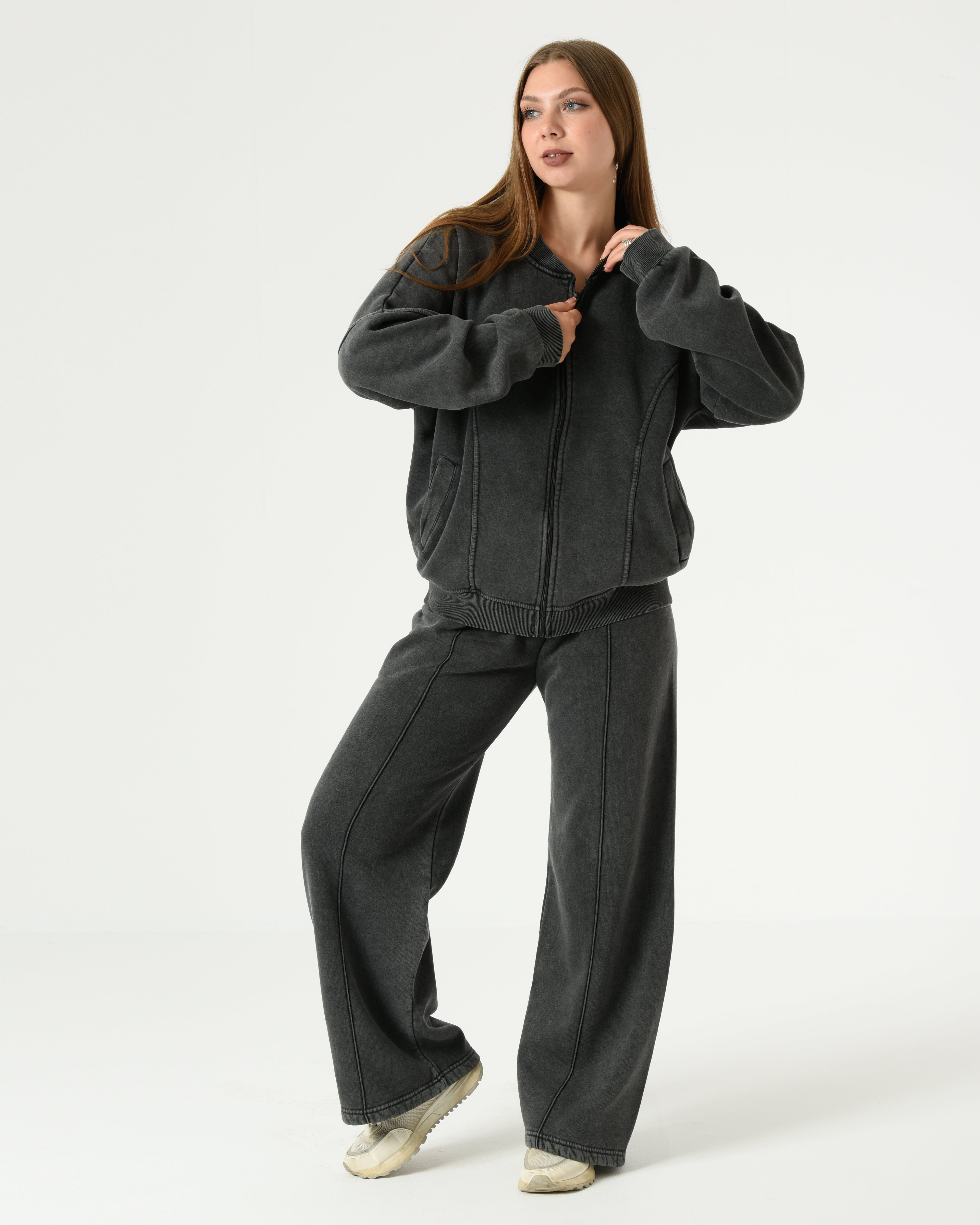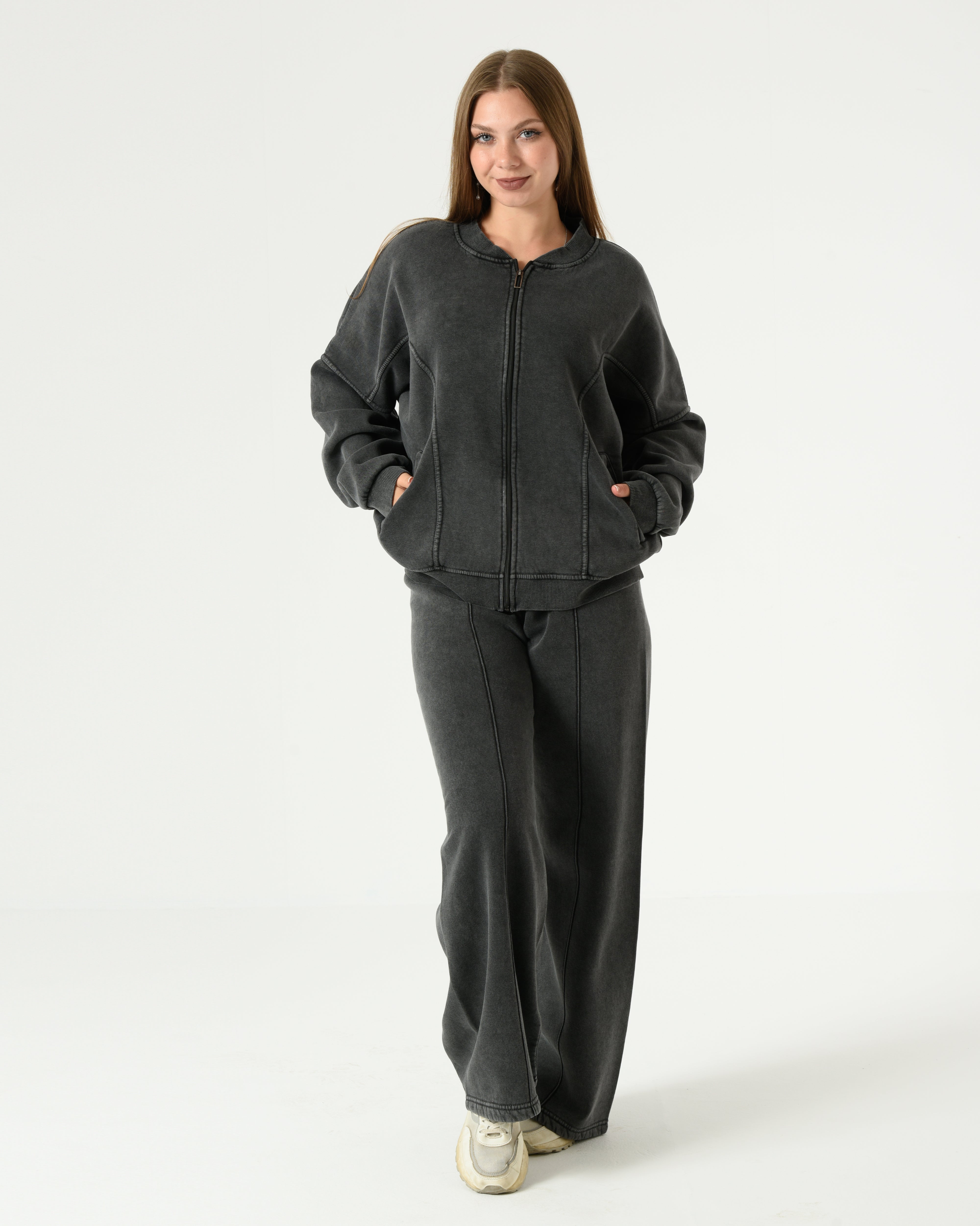 القماش ناعم ومتين، بيدّي إحساس دفا ومظهر تريندي على الموضة، والبنطلون الواسع مع الجاكيت السوستة بيكمّل اللوك العصري المريح.
